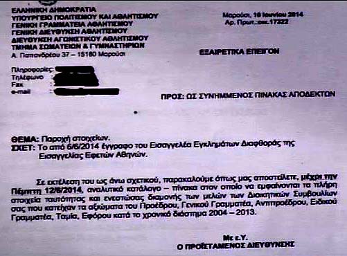 Με έγγραφο του Εισαγγελέα Εγκλημάτων Διαφθοράς της Εισαγγελίας Εφετών Αθηνών προς τη ΓΓΑ στις αρχές του μήνα, ζητήθηκε να καταρτιστεί αναλυτικός κατάλογος στον οποίο να εμφαίνονται τα πλήρη στοιχεία ταυτότητας και διαμονής των μελών των Διοικητικών Συμβουλίων που κατείχαν τα αξιώματα του προέδρου, γενικού γραμματέα, αντιπροέδρου, ειδικού γραμματέα, ταμία, εφόρου κατά το συγκεκριμένο χρονικό διάστημα 2004 – 2013.