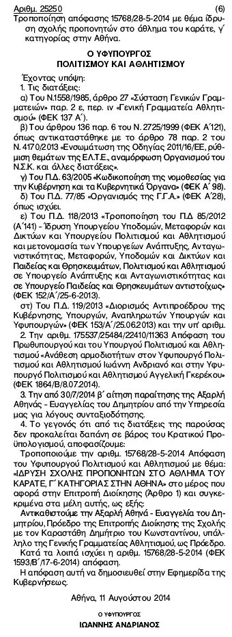 Ιδρύσατε μια παράνομη Σχολή Προπονητών Καράτε περίτρανο μνημείο διαφθοράς, διαπλοκής και ηλιθιότητας! Η αρχή της νομιμότητας επιβάλει να την κλείσετε και να την ιδρύσετε εξαρχής! Αλλά και πάλι, αν δεν με συμβουλευθείτε, πάλι μαλακίες θα κάνετε!!! Με τις πράξεις και τις παραλήψεις σας διασύρετε τον πρωθυπουργό και όλους όσους εργάζονται φιλότιμα και έντιμα για το καλό αυτού του τόπου!!!