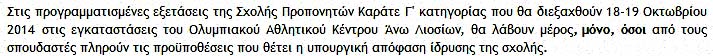 Κατά πληροφορίες μας, η Επιτροπή Διοίκησης της Σχολής Προπονητών Καράτε (ΕΔΣΠΚ) με απόφασή της σε συνεδρίαση της Τετάρτης αποφάσισε, μεταξύ άλλων, να αναβάλει για 15 μέρες τις εξετάσεις της Σχολής, που είχαν αρχικά οριστεί για αυτό το Σαββατοκύριακο 18, 19-10-2014, με σκοπό να έχει τον απαιτούμενο χρόνο να ελεγχθούν όλα τα δικαιολογητικά των μαθητών της Σχολής και να αντιμετωπιστούν με τον πλέον νόμιμο τρόπο όλες οι παρατυπίες.