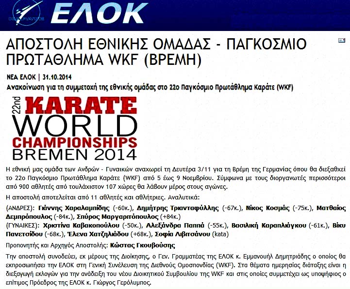 Η ΕΛΟΚ στέλνει ομάδα στους Παγκόσμιους 5,9-11-2014, στη Βρέμη με την ακόλουθη ανακοίνωση: