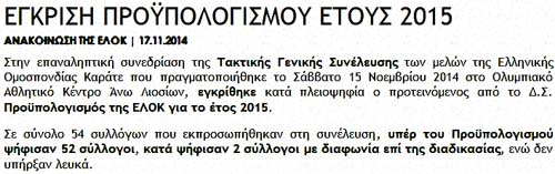 Τέλος η ΕΛΟΚ ανάρτησε στο site της την Τρίτη 18/11/2014 την επόμενη θριαμβευτική ανακοίνωση, στην οποία ομολογείται οι δύο σύλλογοι, που διαφοροποιήθηκαν, "δεν διαμαρτυρήθηκαν για την διαδικασία, ενώ ψήφισαν τον προϋπολογισμό", αλλά "ΚΑΤΑΨΗΦΙΣΑΝ τον προϋπολογισμό, επειδή εκ του πονηρού δεν τηρήθηκε η νόμιμη διαδικασία χρονικά έγκαιρης γνωστοποίησής του στους συλλόγους μαζί με την πρόσκληση για τη ΓΣ"!