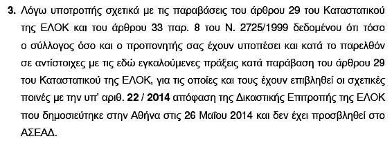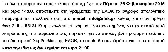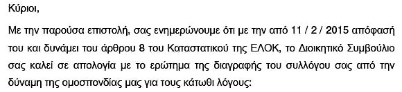 Οι παρόμοιες επιστολές της ΕΛΟΚ προς τέσσερις συλλόγους με την απειλή της διαγραφής και μια φιλική γνωμοδότηση για το τι σημαίνουν και πως αποκρούονται!