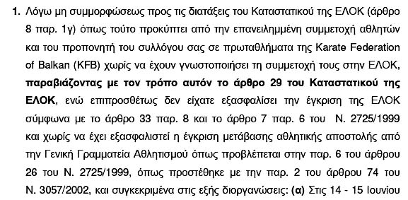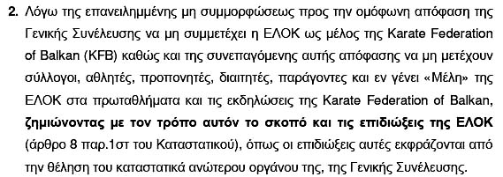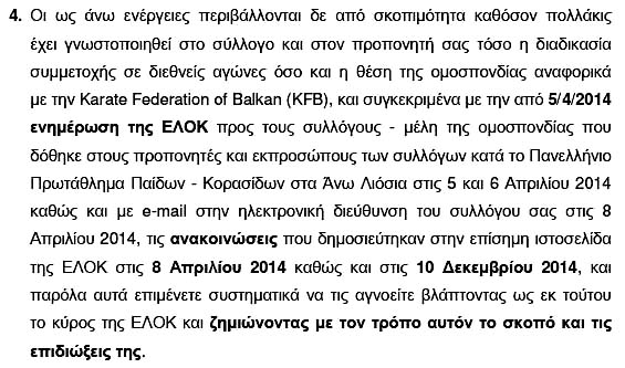 Για αυτήν την απόφαση το Διοικητικό Συμβούλιο της ΕΛΟΚ κατ' εντολή του κ. Γερόλυμπου αποπειράται να εξαπατήσει τους συλλόγους σας, και να πετύχει την διαγραφή μας, ισχυριζόμενη παρανόμως ότι η συμμετοχή αθλητών στους Βαλκανικούς αγώνες, που είναι αναγνωρισμένοι από την WKF, αποτελούν δήθεν παράνομα τελεσθείσες πράξεις των συλλόγων τους και ότι είχαν σκοπό να την βλάψουν !!!