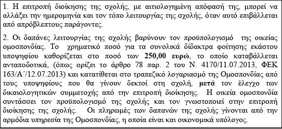 "2. Ïé äáðÜíåò ëåéôïõñãßáò ôçò ó÷ïëÞò âáñýíïõí ôïí ðñïûðïëïãéóìü ôçò ïéêåßáò ïìïóðïíäßáò. Ôï ÷ñçìáôéêü ðïóü ãéá ôá óõíïëéêÜ äßäáêôñá öïßôçóçò åêÜóôïõ õðïøçößïõ êáèïñßæåôáé óôï ðïóü ôùí 250,00 åõñþ, ôï ïðïßï êáôáâÜëëåôáé áíôáðïäïôéêÜ, (üðùò ïñßæåé ôï Üñèñï 78 ðáñ. 2 ôïõ Í. 4170/11.07.2013, ÖÅÊ 163/Á´/12.07.2013) êáé êáôáôßèåôáé óôï ôñáðåæéêü ëïãáñéáóìü ôçò Ïìïóðïíäßáò áðü ôïõò õðïøçößïõò ðïõ èá ãßíïõí äåêôïß óôç ó÷ïëÞ, ìåôÜ ôïí Ýëåã÷ï ôùí äéêáéïëïãçôéêþí óõììåôï÷Þò áðü ôçí åðéôñïðÞ äéïßêçóçò. Ç ïéêåßá ïìïóðïíäßá óõíôÜóóåé ôïí ðñïûðïëïãéóìü ôçò ó÷ïëÞò êáé ôïí ãíùóôïðïéåß óôçí åðéôñïðÞ äéïßêçóçò ôçò ó÷ïëÞò. Ïé ðëçñùìÝò ôùí äáðáíþí ôçò ó÷ïëÞò ãßíïíôáé áðü ôçí áñìüäéá õðçñåóßá ôçò Ïìïóðïíäßáò, ç ïðïßá åßíáé êáé ïéêïíïìéêÜ õðüëïãïò."