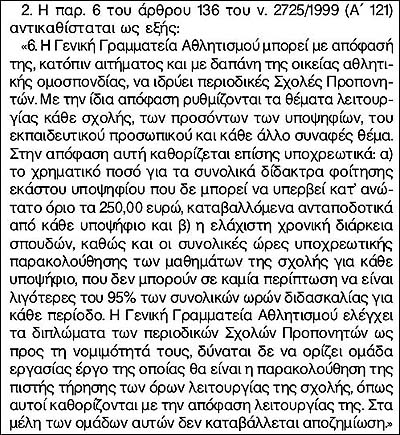 ÅðåéäÞ ïé ðáíåðéóôçìéáêÝò ó÷ïëÝò ãõìíáóôþí äåí ìðïñïýí íá áíôáðïêñéèïýí óôéò áíÜãêåò ôùí óõëëüãùí ôùí äéáöüñùí áèëçìÜôùí ãéá ðñïðïíçôÝò, ï áèëçôéêüò íüìïò 2725/1999 êáé ïé ôñïðïðïéÞóåéò ôïõ Ý÷ïõí ðñïâëÝøåé ôçí ßäñõóç êáé ëåéôïõñãßá "Ó÷ïëþí Åìðåéñéêþí Ðñïðïíçôþí" ãéá ôá äéÜöïñá áèëÞìáôá óå óõíåñãáóßá ôçò ÃÃÁ êáé ôùí ïìïóðïíäéþí, þóôå íá êáëýðôïíôáé êáôÜ ôï äõíáôüí ïé ðñïðïíçôéêÝò áíÜãêåò ôùí óõëëüãùí. Âåâáßùò, åíþ ï íüìïò áñ÷éêÜ Üëëá ðñüâëåðå êáé ôåëéêÜ Üëëá åöáñìüæïíôáé Ý÷åé áðïêáôáóôáèåß ìéá ìåóïâÝæéêç çìéíüìéìç êáôÜóôáóç áðïäåêôÞ áðü üëïõò, ç ïðïßá üìùò ðïëëÝò öïñÝò óôñåâëþíåôáé ëüãù Üãíïéáò Þ/êáé áäéáöïñßáò ôçò ÃÃÁ áðü ôç ìéá êáé óõãêåêñéìÝíùí óôü÷ùí êáé óêïðþí ôùí ïìïóðïíäéþí êáé áõôþí ðïõ ôéò åëÝã÷ïõí áðü ôçí Üëëç. Ïé Ó÷ïëÝò áõôÝò äéïéêïýíôáé áðü ðåíôáìåëÞ ÅðéôñïðÞ Äéïßêçóçò, ìå ôñßá ìÝëç áðü ôç ÃÃÁ óõíÞèùò êáé äýï áðü ôçí ïìïóðïíäßá, åíþ ÄéåõèõíôÞò ôïðïèåôåßôáé ðñüóùðï ðñïôåéíüìåíï áðü ôçí ïìïóðïíäßá.