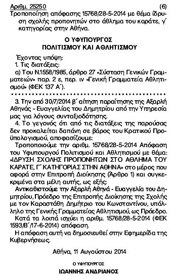 Åðéâåâáßùóç áðü ôï Ðñáêôéêü 11/23-1-15: "Êáôüðéí ôçò Ýããñáöçò åíôïëÞò ôïõ Õöõðïõñãïý Ðïëéôéóìïý & Áèëçôéóìïý (.... 17720/135/23-1-2015) åðéêõñþíïíôáé ôá áðïôåëÝóìáôá ôùí åîåôÜóåùí ôçò Ó÷ïëÞò Ðñïðïíçôþí ÊáñÜôå üðùò êáôáôÝèçêáí óôç ÃåíéêÞ Ãñáììáôåßá Áèëçôéóìïý ìå ôï äéáâéâáóôéêü ôçò ÅËÏÊ, üðïõ åðéóõíÜðôåôáé ó÷åôéêü Ýããñáöï ôïõ Ä/íôÞ. ... Ï Ðñüåäñïò ëáìâÜíåé ôï ëüãï êáé áíáöÝñåé üôé ïé èÝóåéò ôïõ ãéá ôï èÝìá ôùí åîåôÜóåùí ôçò Ó÷ïëÞò åßíáé äéáôõðùìÝíåò óôç óõíåäñßáóç ôçò ÅðéôñïðÞò óôéò 15/10/2015 (Ðñáêôéêü Íï 7) êáé ðáñáìÝíïõí ïé ßäéåò." Ðñéí áðü ôçí õðïãñáöÞ ôïõ óôï Ðñáêôéêü ï Ðñüåäñïò ôçò ÅðéôñïðÞò Äéïßêçóçò ÄçìÞôñçò ÊáñáóôÜèçò ãñÜöåé ôç öñÜóç: "Ìå åíôïëÞ Õöõðïõñãïý" ðñÜãìá ðïõ äåß÷íåé üôé åîáíáãêÜóôçêå Üíùèåí íá õðïãñÜøåé áõôü ôï Ðñáêôéêü!