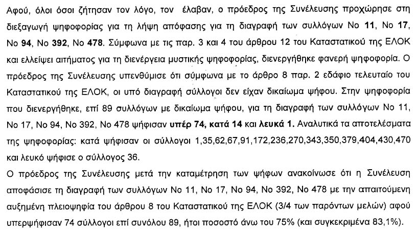 4) Και το τελευταίο και καραμπινάτο: αναφέρονται "έστω και οι αριθμοί" των συλλόγων που ψήφισαν ΚΑΤΑ της διαγραφής, διότι αυτοί μίλησαν επί τόπου, αλλά πουθενά δεν αναφέρονται "έστω και οι αριθμοί" των συλλόγων που ψήφισαν ΥΠΕΡ της διαγραφής, αλλά το πλήθος τους γράφηκε εξ αφαιρέσεως του 14+1 από το 89! Εξ αυτού προκύπτει ότι ο αριθμός 74 του ΥΠΕΡ είναι απόλυτα πλασματικός και καθόλου πραγματικός, διότι πολλοί από τους αντιπροσώπους συνόδευαν αθλητές και είχαν ήδη πάει στους αγώνες, που γίνονταν ταυτόχρονα, για να κοουτσάρουν τους αθλητές τους, και άρα δεν ήταν παρόντες στην ψηφοφορία!