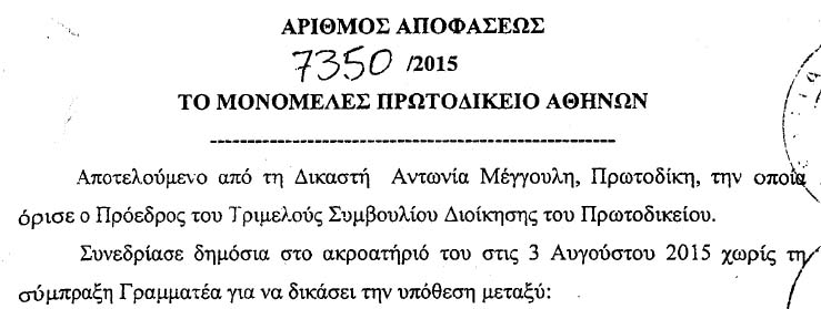 Αυτή είναι η αρχή της Απόφασης 7350/2015 του Μονομελούς Πρωτοδικείου Αθηνών.