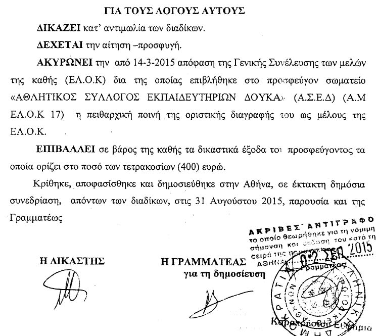 5-5-2015: Οι τέσσερεις σύλλογοι παίρνουν Εισαγγελική παραγγελία προς την ΓΓΑ να μεσολαβήσει για να δώσει η ΕΛΟΚ τα έγγραφα που ζητούνται.