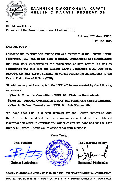 Προς τον κ. Αλεξέι Πετρόφ Πρόεδρο της Βαλκανικής Ομοσπονδίας Καράτε Αθήνα, 27 Ιουνίου, 2014 Αριθμ. Πρωτοκ. 803 Αγαπητέ κ. Πετρόφ Σε συνέχεια της συνάντησης μεταξύ υμών και μελών της Ελληνικής Ομοσπονδίας Καράτε (ΕΛΟΚ) και επί τη βάσει αμοιβαίων επεξηγήσεων και διασαφηνίσεων, που αντηλλάγησαν προς ικανοποίηση και των δύο μερών, σχετικά με το ότι το θέμα της Βαλκανικής Ομοσπονδίας Καράτε έχει πλέον επιλυθεί, η ΕΛΟΚ με την παρούσα υποβάλει ένα επίσημο αίτημα για να εγγραφεί μέλος στη Βαλκανική Ομοσπονδία Καράτε (KFB). Όταν το αίτημά μας γίνει αποδεκτό, η ΕΛΟΚ θα αντιπροσωπευθεί από τα επόμενα άτομα: α) Για το Διοικητικό Συμβούλιο της KFB: κ. Χρήστος Μπουλούμπασης, β) Για την Τεχνική Επιτροπή της KFB: κ. Παναγιώτης Χονδροματίδης, γ) Για την Επιτροπή Διαιτησίας της KFB: κa ... η Βασίλω Πρώτη (!), Ελπίζουμε πως αυτό είναι ένα βήμα προς τα εμπρός για τη Βαλκανική Χερσόνησο και η KFB θα παγιωθεί προς το κοινό συμφέρον όλων των συμβεβλημένων ομοσπονδιών για να συνεχίσει τη λαμπρή πορεία, που είχαμε τα προηγούμενα είκοσι (20) χρόνια. Ευχαριστούμε εκ των προτέρων για την απάντησή σας. Ειλικρινά δικοί σας Ο Πρόεδρος Ο Γενικός Γραμματέας Χρήστος Μπουλούμπασης Εμμανουήλ Δημητριάδης |
