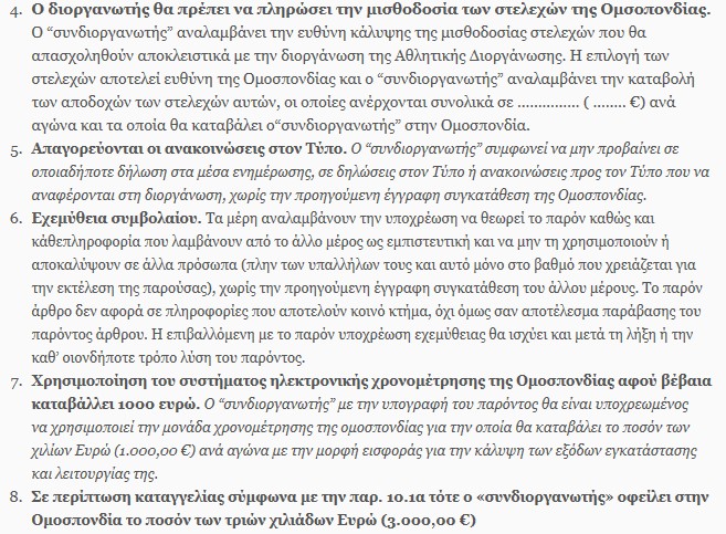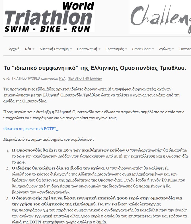 Στο triathlonworld.gr βρήκαμε τα επόμενα σχόλια με αφορμή το Ιδιωτικό Συμφωνητικό μεταξύ ΕΟΤΡΙ και "συνδιοργανωτή", που έχει κατεβάσει η γκλάβα του Αθλητικού Απατεώνα και το οποίο αποδεικνύει και από άλλη μεριά ότι η "Συμμορία Γιώργου και Εμμανουέλλας Γερολύμπου και Συνεργατών Α.Ε.Α." έχει μετατρέψει τη δημόσια ομοσπονδία του δημόσιου αθλήματος του Τριάθλου σε επικερδή οικογενειακή επιχείρηση! Θέλει και ρώτημα ότι οι εκλογές μαϊμού γίνονται, ώστε να καταλήγουν στην τσέπη του Γερόλυμπου τα ... μπικικίνια από τα τέτοιου είδους συμβόλαια??? Το Συμβόλαιο μένει μεταξύ Γερόλυμπου και "Συνδιοργανωτή" ενώ έχει και μοντέρνα ρήτρα "εχεμύθειας"!