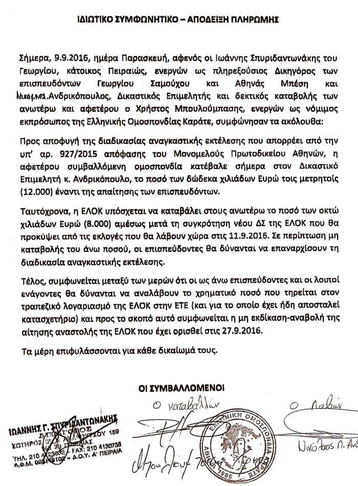 7) τέλος, οι υπάλληλοι θα μπορούν να πάρουν τα χρωστούμενα από το λογαριασμό της ΕΛΟΚ, ο οποίος πρέπει πλέον να χρησιμοποιείται, και με αυτό συμφωνημένο παραιτείται η ΕΛΟΚ από την εκδίκαση την 27-9-2016 της αίτησης αναστολής πληρωμής, που είχε υποβάλει!