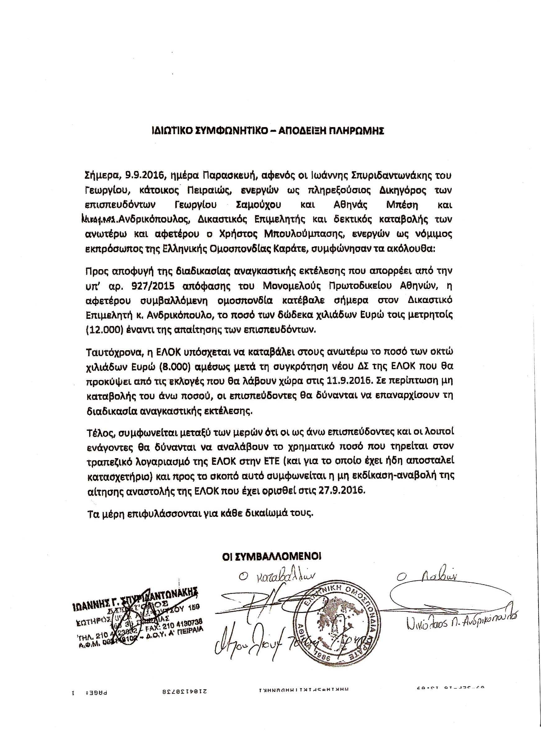 Και επειδή ο Άπιστος Θωμάς ήταν ένας, ενώ οι Απύθμενα Ηλίθιοι, που ψηφίζουν παράνομα Γερόλυμπο είναι 100, σας δίνω δεξιά και το Ιδιωτικό Συμφωνητικό (με κλικ εδώ ολόκληρο), που υπογράφηκε μαζί με την καταβολή των 12.000 € από τον Μπουλούμπαση στον Δικαστικό Επιμελητή! Από το Ιδιωτικό Συμφωνητικό βλέπεται ότι ομολογείται με υπογραφή του προέδρου της ΕΛΟΚ-ΗλΑπ Μπουλούμπαση: