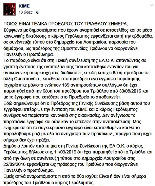 8 Η συμμετοχή του Γερόλυμπου κατά την ημέρα των εκλογών για τη θέση του εκπροσώπου στην ΕΟΕ είναι παράνομη, διότι είναι πρόεδρος στην Ομοσπονδία του Τριάθλου! Αποδεικνύεται περίτρανα κατωτέρω και με βίντεο, όπου το ομολογεί! 1 1 1 1