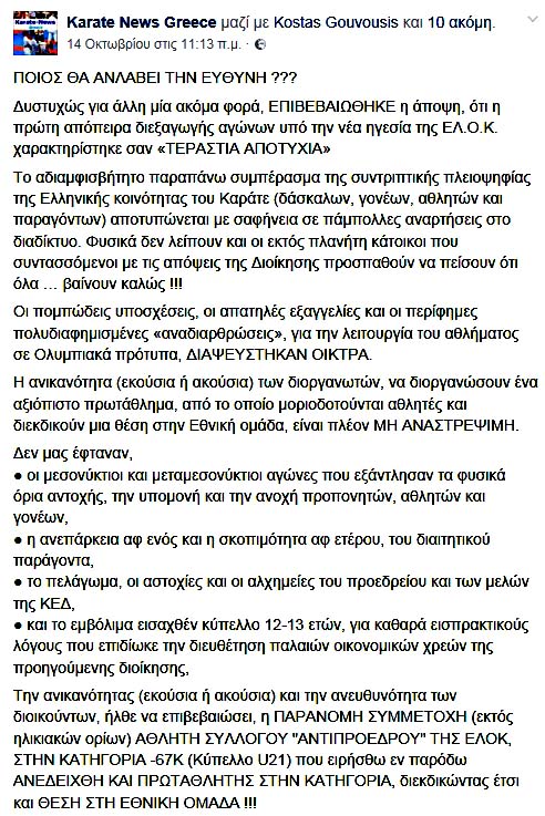 Για την Επιτροπή της ΓΓΑ που Ελέγχει την ΕΛΟΚ: Οι παντός είδους παρανομίες από την πρόσκληση έως και το Πρακτικό και τα αποτελέσματα των παράνομων Εκλογών της ΕΛΟΚ προφανώς αποτελούν και μέρος των όσων έχετε υποχρέωση να ελέγξετε, διότι έχουν διαπραχθεί ένα σωρό παραβάσεις του αθλητικού νόμου σε μείγμα με ποινικά αδικήματα και αυτό το κοκτέιλ διαφθείρει ακόμα περισσότερο το ήδη διεφθαρμένο άθλημα του Καράτε, το οποίο εποπτεύει η ΓΓΑ!