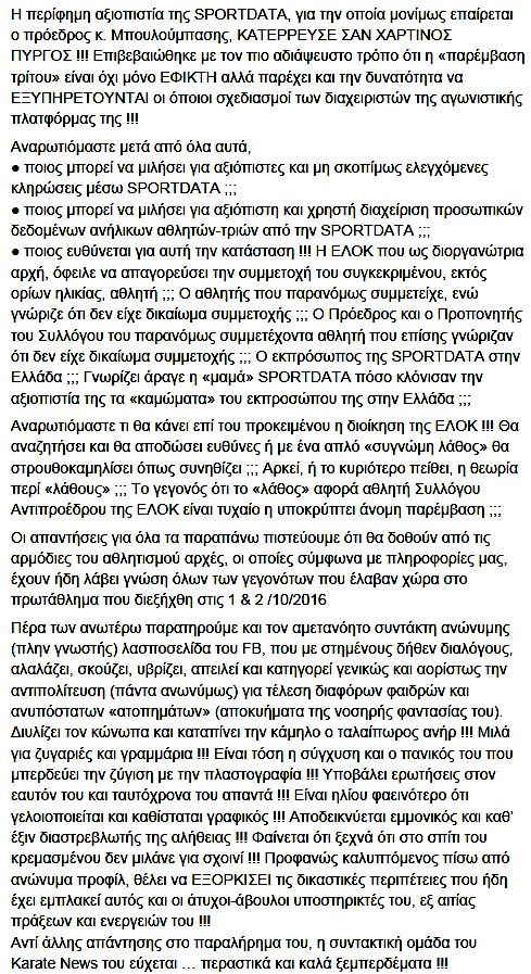 Ένσταση κατά της υποψηφιότητας Παπαδόπουλου για το ΔΣ/ΕΛΟΚ και την ΕΟΕ: Για αυτήν θα πρέπει να δούμε τα στοιχεία που επικαλείται η πλευρά των Γερόλυμπου-Μπουλούμπαση! Και αυτά τα στοιχεία θα πονέσουν μερικούς, αλλά όλοι έχουν το αναφαίρετο δικαίωμα στην πληροφόρηση, εγώ έχω καθήκον για την δημόσια ενημέρωση με γνώμονα την αλήθεια, αλλά ταυτόχρονα στην όλη υπόθεση δεν είσαστε μόνοι σας, αλλά εμπλέκονται και άλλοι ενδιαφερόμενοι, οι οποίοι δεν τα γνωρίζουν όλα και θα πρέπει να τα πληροφορηθούν, όπως είναι η Γενική Γραμματεία Αθλητισμού και η Παγκόσμια Ομοσπονδία Καράτε!