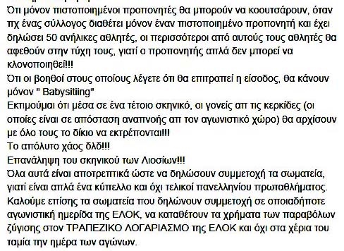 Μετά την ανάληψη των καθηκόντων του από το νέο ΔΣ/ΕΛΟΚ έγιναν 2-3 εκδηλώσεις της ΕΛΟΚ, που προκάλεσαν τεράστιες αντιδράσεις με τις καταφανείς αποτυχίες τους! Χωρίς να υπεισέλθουμε σε λεπτομέρειες παραθέτουμε τις γενικότερες εντυπώσεις για εκδηλώσεις που ήδη έγιναν, αλλά και για τις άμεσα επερχόμενες κατά ακριβέστατη και μοιραία πρόβλεψη!