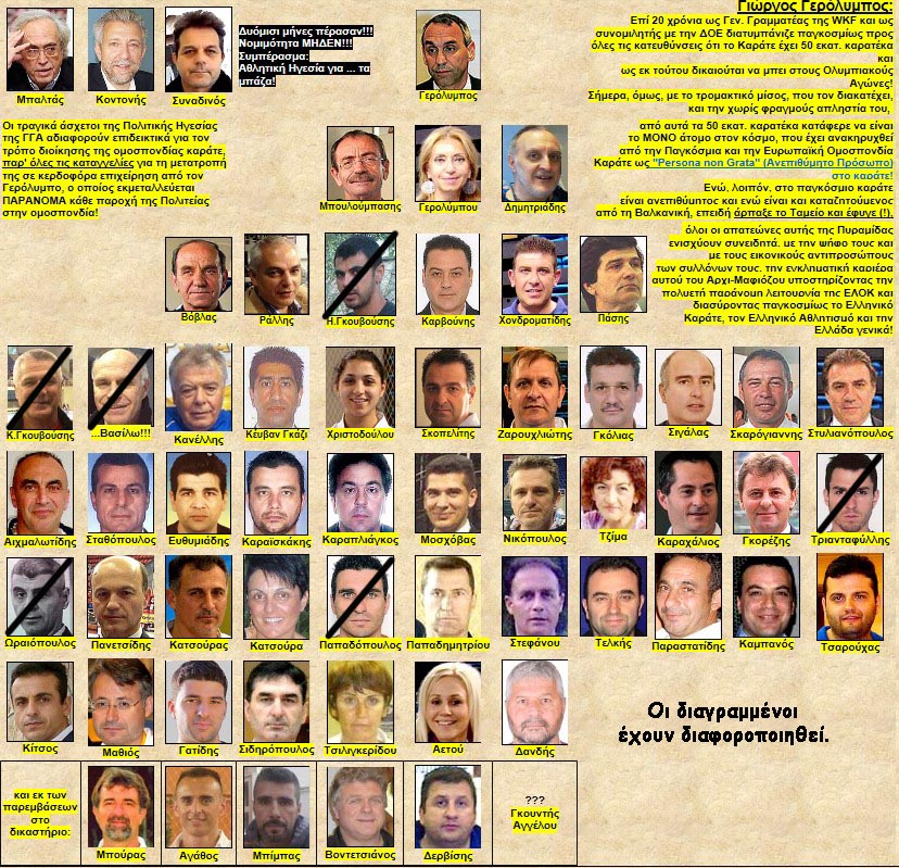 20 - Ο Γερόλυμπος έχει μπει κατά καιρούς στην Ολυμπιακή Επιτροπή από το Χόκεϊ, παρά λίγο από το Σόφτμπολ, απαιτητικά από το Κέρλινγκ και έφαγε πόρτα και τελευταία από το Τρίαθλο επί δύο τετραετίες μέχρι να του κόψει το βήχα με αυτή την απάτη του Τριάθλου ο Γιάννης Ανδριανός. Τώρα τους μπαίνει από το καράτε, χωρίς να έχει θέση στο ΔΣ της ΕΛΟΚ και όντας ακόμα πρόεδρος του Τριάθλου, του οποίου έχει αφαιρεθεί η φίλαθλη αναγνώριση. Καραμπινάτη αθλητική παρανομία και υπόθαλψη αθλητικού εγκληματία από την ΕΟΕ!