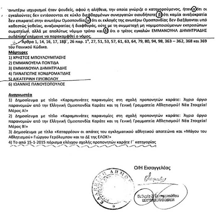 Την 11η/6/2019, ημέρα Τρίτη, δικάζομαι στο Δ΄ Μονομελές με μηνυτές τον Μπουλούμπαση, την Ποντίδα και τον Δημητριάδη για δημοσιεύματά μου στο www.karate.gr σχετικά με τη λειτουργία της περίφημης Σχολής Προπονητών του 2014 με το επόμενο κατηγορητήριο! Η Δίκη αυτή για μένα είναι απλός περίπατος, αλλά για εσάς και αν θα έρθετε να καταθέσετε υπέρ εμού και αθωωθώ θα είναι ένα δυναμικό χτύπημα κατά του Γερόλυμπου! Θα διευκρινήσω τα "γιατί" μετά από το Κατηγορητήριο.