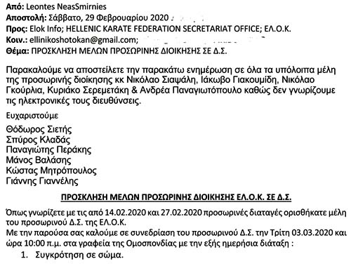 Στις 17 Φεβρουαρίου 2020 τα παραπάνω εικονιζόμενα Σωματεία καράτε, κατέθεσαν στο Πρωτοδικείο Αθηνών αίτηση, με την οποία ζητούν την μεταρρύθμιση της απόφασης του ίδιου Δικαστηρίου, που εκδόθηκε τρεις ημέρες νωρίτερα, και με την οποία ορίσθηκε προσωρινή Διοίκηση στην ΕΛ.Ο.Κ, αποτελούμενη από 11 πρόσωπα, εκ των οποίων έξι (6) προτεινόμενα από την πλευρά της έκπτωτης Διοίκησης, τριών(3) από την αντιπολίτευση και δύο (2) από την WKF. Αποκλειστική αρμοδιότητα της προσωρινής διοίκησης το δικαστήριο όρισε την διαχείριση των άμεσων, θεμάτων μέχρι την διενέργεια εκλογών για αιρετή Διοίκηση.