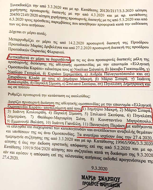 ΣΧΟΛΙΟ www.karate.gr: Κατά τη γνώμη μου, η Απόφαση ΣΑΦΩΣ και δεν ακυρώνει την προηγούμενη συγκρότηση σε ΔΣ, αλλά αντικαθιστά τους παραιτηθέντες με νέους στις θέσεις των παραιτηθέντων! Αν απειλείτε ότι θα ελεγχθούν πέντε πράξεις του ΔΣ πέντε ημερών, φαντάσου τι θα βρούν οι αρμόδιοι όταν ελεγθούν οι πράξεις της "Γερόλυμπος & Σ(υμμορ)ία" των 25 ετών!!!