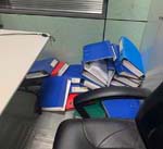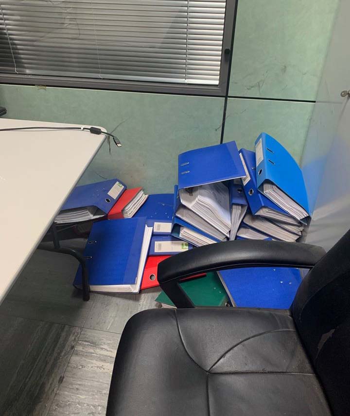 Στην τέταρτη φωτό φαίνονται πέντε κουτιά με οτιδήποτε μέσα τους, ενώ την ημέρα, που πήγα εγώ, στο πάτωμα ήταν περισσότερα από 10-15 κουτιά ανοιγμένα και άτακτα! Τέλος, στην πέμπτη φωτό φαίνονται φάκελοι πεταμένοι στο πάτωμα! Υπήρχαν 4-5 τέτοια "βουνά φακέλων" σε γραφεία και πάτωμα, όταν πήγε η αντιπολίτευση!!!
