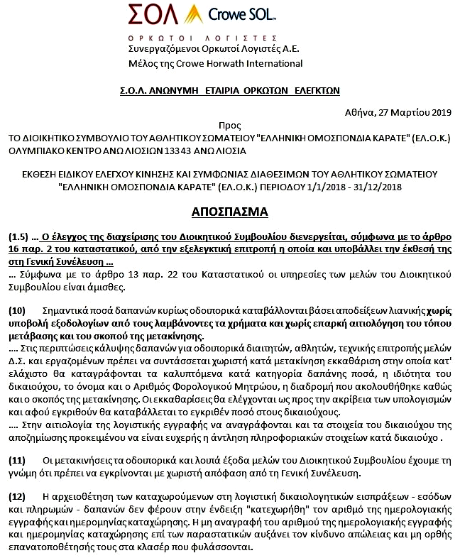 Απόσπασμα έκθεσης του Σώματος Ορκωτών Λογιστών: Ο Γερόλυμπος τους προσλάμβανε ώστε 1) να λέει στην Ελεγκτική Επιτροπή ότι ελέγχθηκαν τα οικονομικά της ΕΛΟΚ, να αποφεύγει τον πραγματικό έλεγχό της και να καλύπτεται στις Γενικές Συνελεύσεις ότι δήθεν τα οικονομικά ελέγχθηκαν, και 2) να λέει στα Δικαστήρια ότι η ΕΛΟΚ ελέγχεται από Ορκωτούς Λογιστές, ελεγκτές με "πιασάρικο" όνομα!