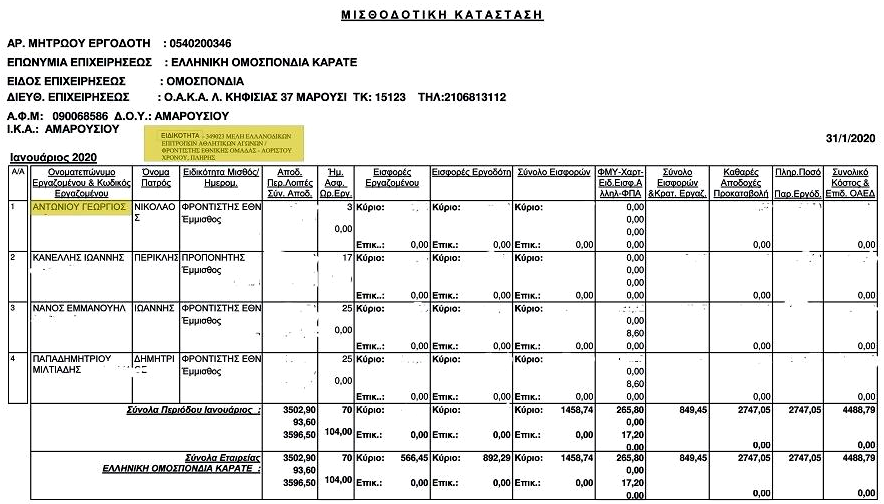 Όπως προκύπτει από την μισθοδοτική κατάσταση Ιανουαρίου 2020 της ΕΛΟΚ (φωτό), ένα νέο μέλος προστέθηκε στο υπάρχον υπαλληλικό προσωπικού της Ομοσπονδίας μας, πέραν των Ιωάννη Κανέλλη (προπονητού), Εμμανουήλ Νάνου (φροντιστή Εθνικών ομάδων) και Παπαδημητρίου Μιλτιάδη (επίσης φροντιστή Εθνικών ομάδων). Φυσικά τους δύο τελευταίους εμείς τους γνωρίζαμε σαν υπάλληλους γραφείου της Ομοσπονδίας. Τώρα γιατί αναφέρονται σαν φροντιστές ο νέος πρόεδρος ΙΩΑΝΝΗΣ ΚΟΥΛΟΥΡΙΔΗΣ ή ο Γενικός Γραμματέας ΔΗΜΗΤΡΙΟΣ ΜΑΚΡΗΣ ή ο Ταμίας ΣΤΥΛΙΑΝΟΣ ΣΚΟΥΦΙΑΣ αφού συμβουλευτούν την πρώην πρόεδρο ΕΜΜΑΝΟΥΕΛΛΑ ΠΟΝΤΙΔΑ ΓΕΡΟΛΥΜΠΟΥ ή τον πολυπράγμονα ΜΑΡΙΟ ΣΙΤΑΡΑ … ίσως μας διαφωτίσουν.