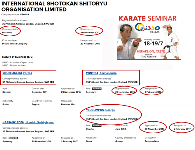 Οι Γερόλυμπος, Ποντίδα και Γκάζi (αφανής εδώ, αλλά υπαρκτοί και ο ίδιος και ο γιός του) ανοίγουν με κάποιον ... Γιαουρτογλού άνω την "International Shotokan Shitoryu Organisation" στην Ιρλανδία την 29-11-2016 και στη συνέχεια παραιτούνται από τις θέσεις τους την 2-2-2017 με την εταιρεία να κλείνει την 19-12-2017.