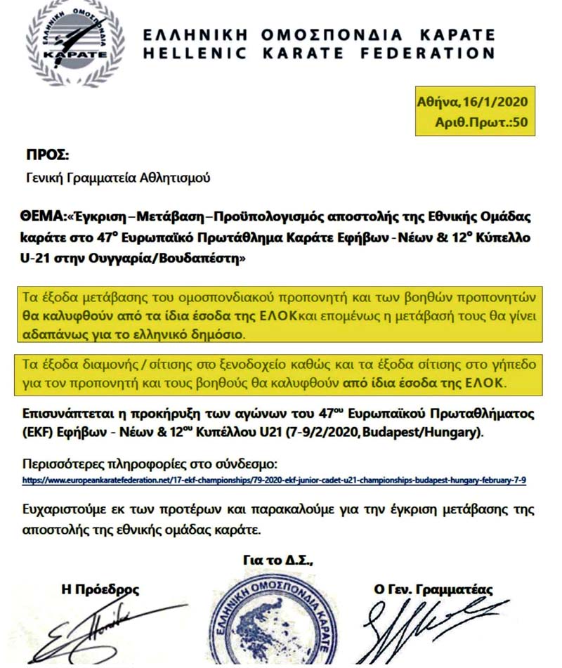 H ΕΛ.Ο.Κ. στις 16/01/2020 στέλνει στη Γ.Γ.Α. έγγραφο με αριθμό πρωτοκόλλου 50 με θέμα την έγκριση μετάβασης και τον προϋπολογισμό της αποστολής της Εθνικής ομάδας Εφήβων- νέων & under 21 στο Πανευρωπαϊκό πρωτάθλημα καράτε στη Βουδαπέστη της Ουγγαρίας.
