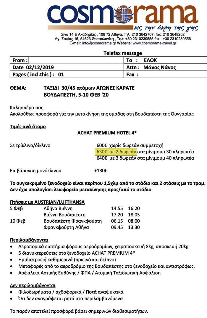 Στην έγγραφη προσφορά του ταξιδιωτικού πρακτορείου COSMORAMA, που δημοσιεύουμε, φαίνεται ότι το κόστος ταξιδίου είναι 600€ ανά άτομο και εάν η ομοσπονδία θέλει και δύο (2) δωρεάν συμμετοχές το κόστος ανεβαίνει στα 630€ ανά άτομο.