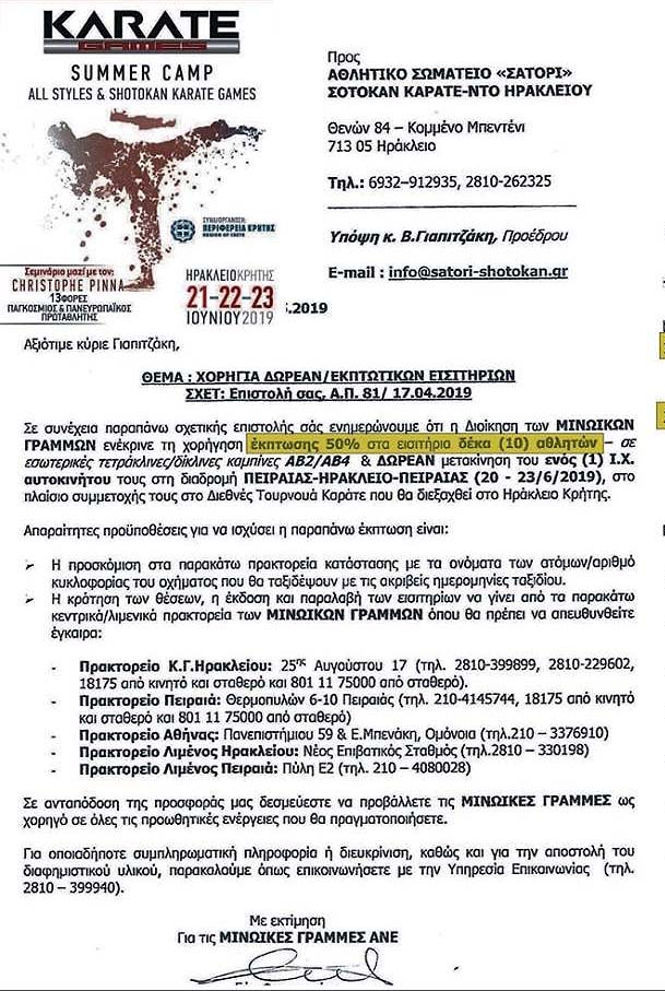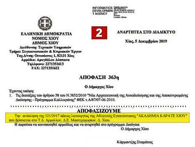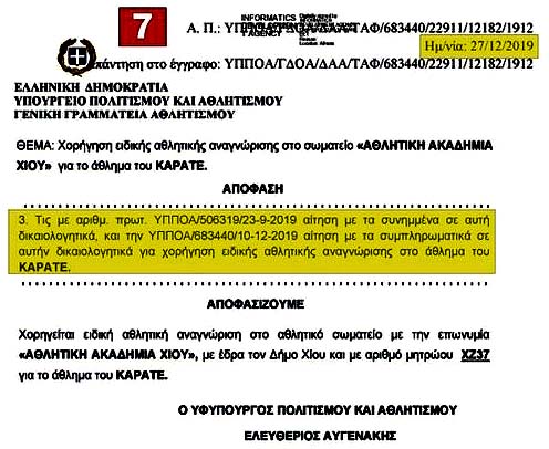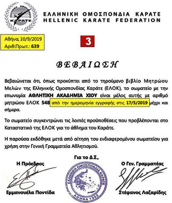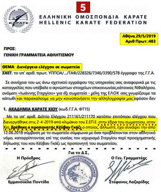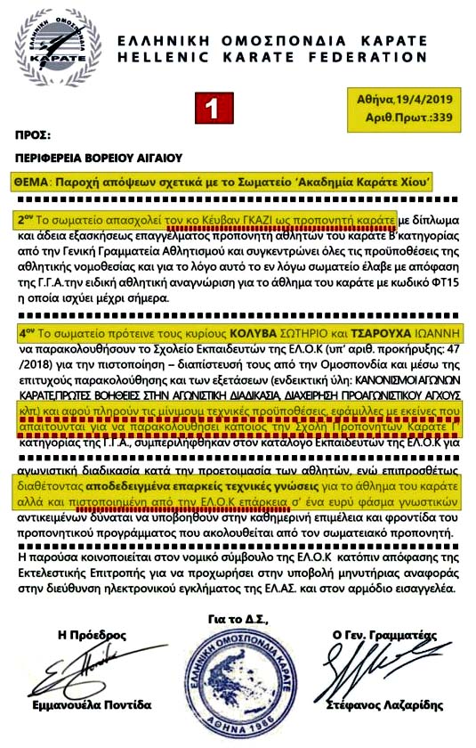 Σε άλλο έγγραφο της Ομοσπονδίας προς την περιφέρεια (Σχετ. 1) με αριθμό πρωτοκόλλου 483-29/5/19 η διοίκηση βεβαιώνει μεν ότι νόμιμος και επίσημος προπονητής του συλλόγου είναι ο κάτοικος Αθηνών Κέυβαν Γκάζι, αλλά και ότι οι κύριοι Γιάννης Τσαρούχας και Σωτήρης Κολυβάς κάτοικοι Χίου, προφανώς αυτοί, πληρούν τεχνικές προϋποθέσεις ΕΦΑΜΙΛΛΕΣ με αυτές του διπλωματούχου προπονητή καράτε από τη Γ.Γ.Α. και έχουν ΠΙΣΤΟΠΟΙΗΜΕΝΗ ΑΠΟ ΤΗΝ ΕΛ.Ο.Κ. επάρκεια για να βοηθούν στην ΚΑΘΗΜΕΡΙΝΗ επιμέλεια και φροντίδα του προπονητικού προγράμματος!!