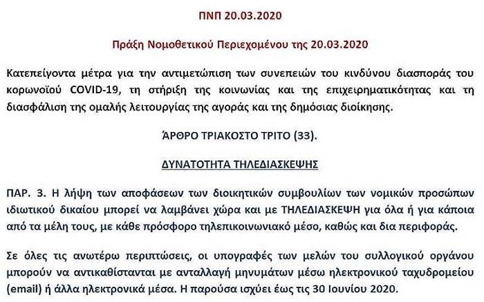 Ας δούμε λοιπόν τι λέει (συνημμένη φωτό) για την δυνατότητα ΤΗΛΕΔΙΑΣΚΕΨΗΣ η από 20.3.2020 ΠΝΠ (πράξη νομοθετικού περιεχομένου) που ισχύει έως τις 30 Ιουνίου 2020, στο άρθρο 33 παρ. 3. (https://www.taxheaven.gr/…/%CE%A0%CE%9D%CE%A020.03.20…/2020…)