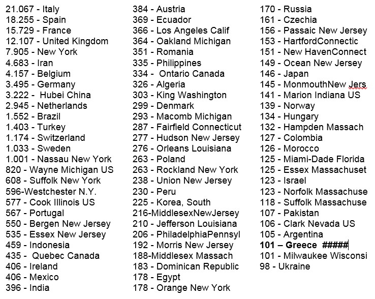 Έτσι, η Ελλάδα έχει σήμερα ένα σχετικά μικρό αριθμό 2170 κρουσμάτων και εξ αυτών 101 θανάτων παρόλο που έχει αδύνατη οικονομία και πολύ κάτω του μετρίου υγειονομικό σύστημα, ενώ άλλες γειτονικές μας χώρες, όπως η Ιταλία, η Ισπανία, η Αγγλία, η Γερμανία αλλά και η μακρινή Αμερική, με πιο εύρωστες οικονομίες και ισχυρότατα υγειονομικά συστήματα ζουν εφιάλτες εκατοντάδων χιλιάδων κρουσμάτων και χιλιάδων θανάτων!