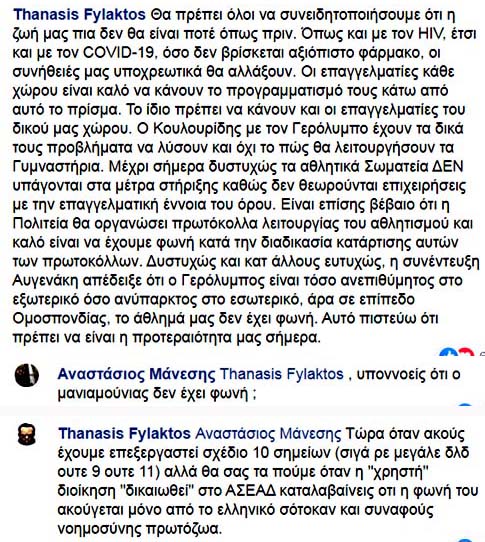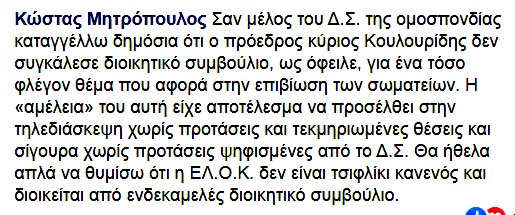 Συνιστούμε στον κ. Κουλουρίδη εφεξής να είναι πολύ πιο προσεκτικός σε ότι ανακοινώνει στην επίσημη ιστοσελίδα της ΕΛΟΚ, ειδικότερα δε, να μην την χρησιμοποιεί για διασπορά ψευδών ειδήσεων. Του τονίζουμε πως καθώς το περιεχόμενο των τηλεδιασκέψεων είναι καταγεγραμμένο τα λεγόμενα του είναι επαληθεύσιμα. Η ΕΛΟΚ δεν είναι “τσιφλίκι” του ώστε να ενεργεί κατά το δοκούν και του επισημαίνουμε πως στην παρούσα χρονική περίοδο ΟΥΔΕΙΣ σύλλογος έχει την πολυτέλεια να ακούει ευχολόγια και αοριστίες. [Συμφωνώ!]