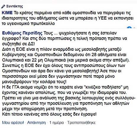 Αυτή τη φορά η απάντηση του Γερόλυμπου ήρθε από το μέχρι τώρα μουγγό Ελληνικό Shotokan/Ελληνικό Ολυμπιακό στο FB την 26 Απριλίου, στις 7:43 μ.μ.
