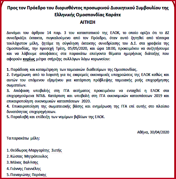 Το Ελληνικό Shotokan και το Ελληνικό Ολυμπιακό Καράτε θέλουν να ενημερώσουν τους φίλους τους οτι η νόμιμα εκλεγμένη Διοίκηση της ΕΛΟΚ, αυτή η οποία προήλθε απο την δική σας βούληση στις εκλογές και η οποία σύντομα αναμένουμε να δικαιωθεί στο ΑΣΕΑΔ που έχει προσφύγει και να επανέλθει στα καθήκοντα της, επεξεργάζεται σχέδιο 10 σημείων-άμεσων δράσεων που σκοπό θα έχουν την επανεκκίνηση του αθλήματος και την ταυτόχρονη ελάφρυνση καθώς και απευθείας ενίσχυση των συλλόγων μελών μας. Αυτό θα γίνει με στοχευμένες δράσεις και συγκεκριμένο χρονοδιάγραμμα τα οποία θα ανακοινωθούν όταν θα έχουμε τις οριστικές κυβερνητικές αποφάσεις για τη επαναφορά στην λειτουργία του κράτους.
