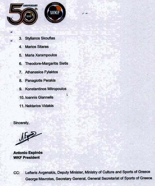 7. Εξίσωση βαθμού 3ου DAN W.K.F. με αντίστοιχο της ΕΛ.Ο.Κ., του Παγκόσμιου Πρωταθλητή Γιώργου Τζάνου.