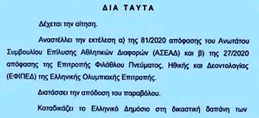 3. Χωρίς να έχουμε ενημερωθεί, όπως κανονικά ο νόμος προβλέπει, πληροφορηθήκαμε τη Παρασκευή 19.03.21 ότι έχει εκδοθεί ερήμην μας απόφαση του Διοικητικού Εφετείου Αθηνών, η οποία αναστέλλει την περαιτέρω εκτέλεση (όχι την ισχύ) της παραπάνω απόφασης της ΕΦΙΠΗΔ. Αντίθετα με όσα εντέχνως διασπείρονται, πρόκειται για μια προσωρινή απόφαση που απλώς αποτρέπει τη διενέργεια νέων πράξεων εκτέλεσης εις βάρος των εν λόγω προσώπων, κάτι βεβαίως που δεν είναι στις προθέσεις και προτεραιότητες της παρούσας διοίκησης. Η νομιμότητα της απόφασης της ΕΦΙΠΗΔ θα κριθεί μετά από πολλούς μήνες ή, σωστότερα, χρόνια, όταν δικαστεί τελεσιδίκως η αίτηση ακυρώσεως των αιτούντων.