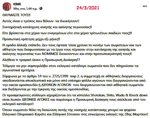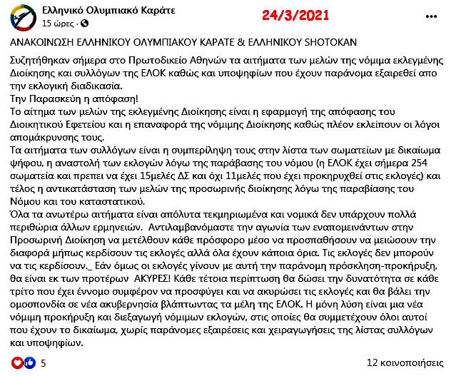 Θέλουμε μόνο να διαβεβαιώσουμε όλους ότι η σημερινή εξέλιξη και η μη διενέργεια μεθαύριο των εκλογών, τις οποίες κάποιοι έκαναν τα πάντα για να τις αποφύγουν, απλώς αναβάλλει για λίγο, για πολύ λίγο, την επανεκκίνηση του ελληνικού Καράτε από υγιείς βάσεις, μακριά από πρόσωπα και τακτικές του παρελθόντος.