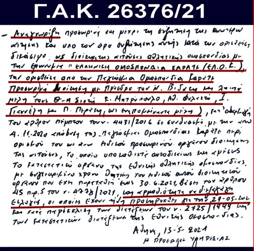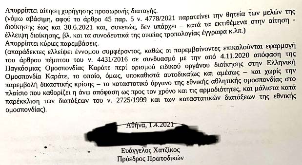 Επομένως, επειδή ακριβώς δεν απαιτείται η έκδοση δικαστικής απόφασης αφού ούτως ή άλλως εμείς είμαστε εκ του νόμου η νόμιμη διοίκηση της ΕΛΟΚ, ως όργανο διοίκησης ορισθέν από την WKF, την 4.11.2020, υποκαθιστώντας αυτοδικαίως το καταστατικό όργανο διοίκησης (ΔΣ), ανεξαρτήτως του αν έχει παραταθεί η θητεία του, γι αυτό δεν έχουμε κανέναν λόγο (:έννομο συμφέρον) να ζητάμε την έκδοση δικαστικής απόφασης.