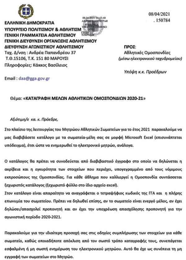 Νέο φρούτο Αυγενάκη: Όλα τα σωματεία να ξανα-υποβάλουν όλα τα δικαιολογητικά τους για το 2021!!!