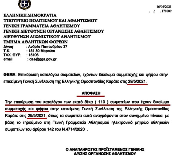 1. Μετά την αναβολή των εκλογών της 28.3.2021 λόγω της από 24.3.2021 Προσωρινής Διαταγής του κ. Κασίμη που δημοσιεύθηκε την 26.3.2021, λαμβάνοντας υπ΄ όψιν τις προθεσμίες που προβλέπονται από τον νόμο και σε συνεννόηση με την Παγκόσμια Ομοσπονδία Καράτε, αποφασίστηκε να προκηρυχθούν οι εκλογές της Ομοσπονδίας το Σάββατο 29 Μαΐου 2021.