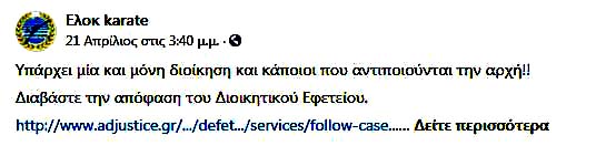 "Σήμερα δημοσιεύθηκαν οι δύο αποφάσεις του Μ.Π.Α., οι οποίες δικαίωσαν πλήρως τις προσπάθειες της Ελληνικής Πολιτείας δια του Υφυπουργού Αθλητισμού κου Λευτέρη Αυγενάκη, της Παγκόσμιας Ομοσπονδίας Καράτε και προσωπικώς του Προέδρου της Αντόνιο Εσπίνος για την εδραίωση της χρηστής διοικήσεως και στην οικογένεια του Ελληνικού Καράτε."