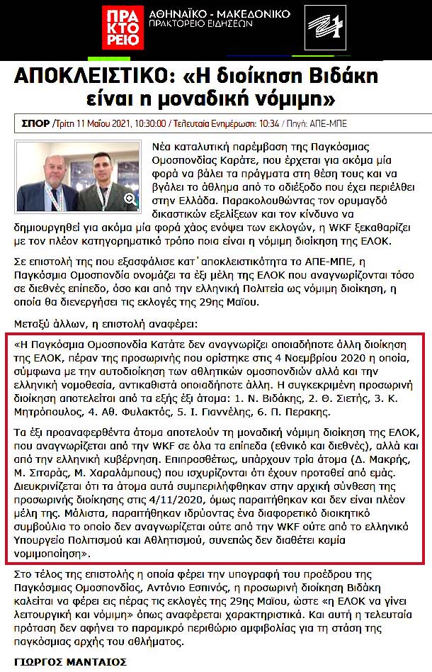 Στο καπάκι με την ανάρτηση του παρόντος άρθρου και το μεσημέρι της 11ης/5/2021 το Hellenic Karate News ανήρτησε ένα άρθρο του ΑΠΕ-ΜΠΕ προφανώς κατασκευασμένο από τη νοσηρή σκέψη του Σπύρου Δρακόπουλου!