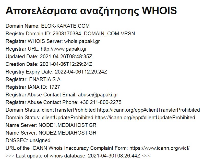 Φυσικά το domain name ELOK-KARATE.COM, όπως αποδεικνύεται από το "who is" των domains είναι το επόμενο με βεβαία ημερομηνία κατοχύρωσης την 6/4/2021 και καμιά άλλη νωρίτερη!!!