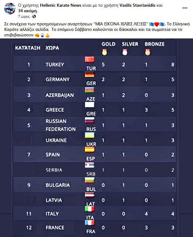 Εδώ μαθαίνουμε ότι οι δύο Ξένοι γυμνάζονταν και με τον Δημήτρη Τριανταφύλλη, που έχει και αυτός δικό του γυμναστήριο! Από την άλλη μεριά, η προσωπικότητα του πρωταθλητή είναι ιδιόμορφη! Δεν αρκείται σε αυτά που του δίνει μια κοινή προπόνηση, αλλά κυνηγάει το "πολύ περισσότερο"! Αυτός είναι ο λόγος που βγαίνει και πρωταθλητής!!! Όλα, λοιπόν, αυτά τα παιδιά, που πήραν μετάλλια, κρατήθηκαν μόνα τους σε φόρμα 15 μήνες, που όλα τα γυμναστήρια ήταν κλειστά και οι προπονήσεις απαγορεύονταν! Συνεπώς, αποτελεί μεγάλη ηλιθιότητα για την προσωρινή διοίκηση να θέλει να καπηλευτεί τις επιτυχίες τους και να βάλει το όνομά της σε αυτές για να παίρνει έστω και ψίχουλα από τα εύσημα των πρωταθλητών, όπως ήδη κάνει! Από την άλλη μεριά, όλα αυτά τα παιδιά είναι δημιούργημα της παλιάς διοίκησης της ΕΛΟΚ, όπως και όλοι οι εν ενεργεία σήμερα αθλητές!!! Ακόμα το ΚΙΜΕ δεν έχει διοικήσει και δεν έχει παράξει έργο στον τεχνικό τομέα του καράτε! Η μετάβαση των αθλητών στους αγώνες είναι υποχρέωση της διοίκησης χωρίς να της δίνει ούτε 1% μερίδιο στις επιτυχίες των αθλητών! Και ας δούμε και τον πίνακα μεταλλίων: