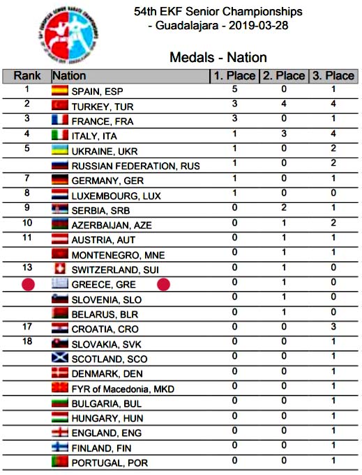 Τον Πίνακα Μεταλλίων τον δημοσίευσε το Hellenic Karate News και μας βγάζει την Ελλάδα 4η σε μετάλλια! Αν, όμως, θελήσουμε να δούμε τον πίνακα αυτό σε σύγκριση με εκείνον του 2019, που ακολουθεί, τότε στον δεύτερο θα βρούμε την Ελλάδα στην 13η θέση με ένα χάλκινο μετάλλιο μόνο!!! Γιατί αυτό? Η απάντηση φαίνεται στους δύο πίνακες και είναι απλή: οι "δυνατές" χώρες δεν κατέβασαν αθλητές λόγω της πανδημίας, πράγμα που σημαίνει ... μάπα το καρπούζι των πανευρωπαϊκών, ενώ εμείς είμασταν τυχεροί λόγω του ότι οι πρωταθλητές μας είχαν προπονητή και γυμναστήριο στο ... τσεπάκι τους!!! Εκτός αν στους αγώνες έβαλε το χεράκι του και ο ... Θεός Εσπίνος!!!