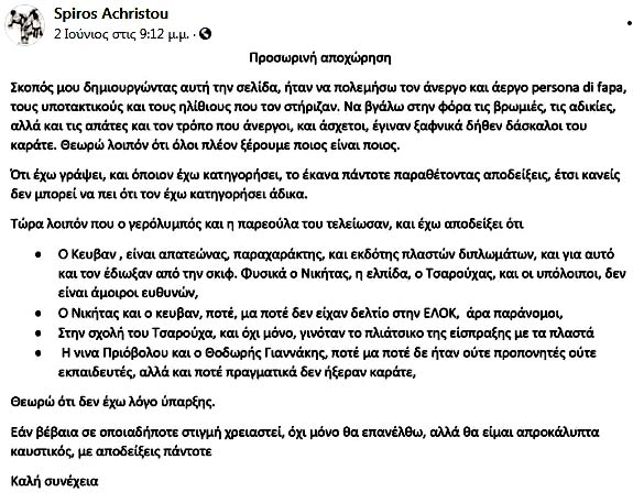 Η ανωτέρω ανάρτηση έγινε προχθές την 26/6/2021. Ο προπονητής στις φωτό είναι ένας και μοναδικός και άρα είναι το μέλος του ΔΣ/ΕΛΟΚ Σταύρος Σταυριανίδης, τα διπλώματα Κύου τα έχει υπογράψει αυτός ο ένας προπονητής Σταύρος Σταυριανίδης, ο οποίος εκτός από βλάκας εξαπατά και τα παιδάκια, διότι τους δίνει δικά του διπλώματα λέγοντάς τους ότι παίρνουν διπλώματα παραδοσιακού καράτε! Αυτός ο βλάκας, λοιπόν, θέλει μαζί με τους άλλους βλάκες του ΔΣ/ΕΛΟΚ να αρπάξουν το παραδοσιακό καράτε!!! Επομένως, ο Μάστερ πρέπει πριν νυχτώσει να εκπέσει από μέλος του ΔΣ/ΕΛΟΚ!