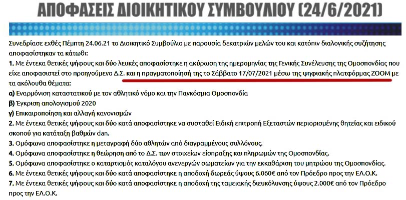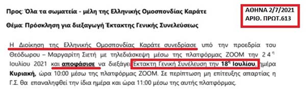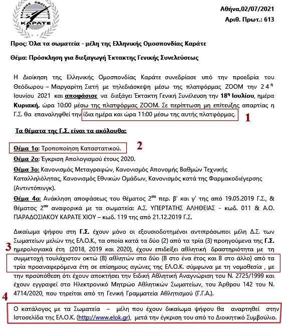 3) επιστολή μου στις 04/07/2021 με τους λόγους ακύρωσης της Γ.Σ της ΕΛ.Ο.Κ στις 18/07/2021 καθώς και ότι συνεχίζεται ο εμπαιγμός των μελών της Ομοσπονδίας διότι συγκαλείται Γ.Σ ενώ τα θέματα τα οποία θέτετε προς συζήτηση (σε πολύ μικρό χρονικό διάστημα χωρίς ουσιαστική διαβούλευση μεταξύ των μελών της Ομοσπονδίας) έχουν ελλιπή και ανεπαρκή τεκμηρίωση μην έχοντας νομικό - οικονομικό και τεχνικό υπόβαθρο αλλά στηρίζονται σε γενικότητες και με πρόφαση την αλλαγή του καταστατικού μας και την συμμόρφωση αυτού με τον νεο αθλητικό νόμο, προσπαθείτε να εκμαιεύσετε την ψήφο των μελών της Ομοσπονδίας προκειμένου, να πάρετε λευκή επιταγή για το έργο σας κατά το παρελθόν, το παρόν και το μέλλον